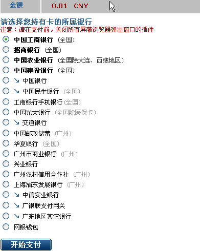 3、查看网银在线支持的银行,并选择自己已经开通网上支付的银行,点击开始支付。推荐工商银行,最低汇款可以到1分钱。