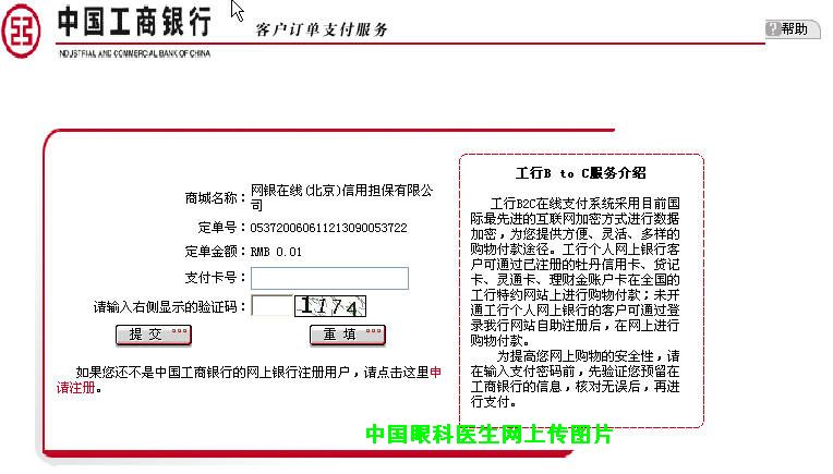 4、弹出中国工商银行的网上银行支付界面,填入您工商银行网上银行支付卡号(可以在线申请)提交,然后确认并输入密码就可以完成整个交易。支付成功后可看得“到商城取货”字样,点击后显示“在线支付成功”,再点击查看订单,显示订单已经确认,付款已经付清。
